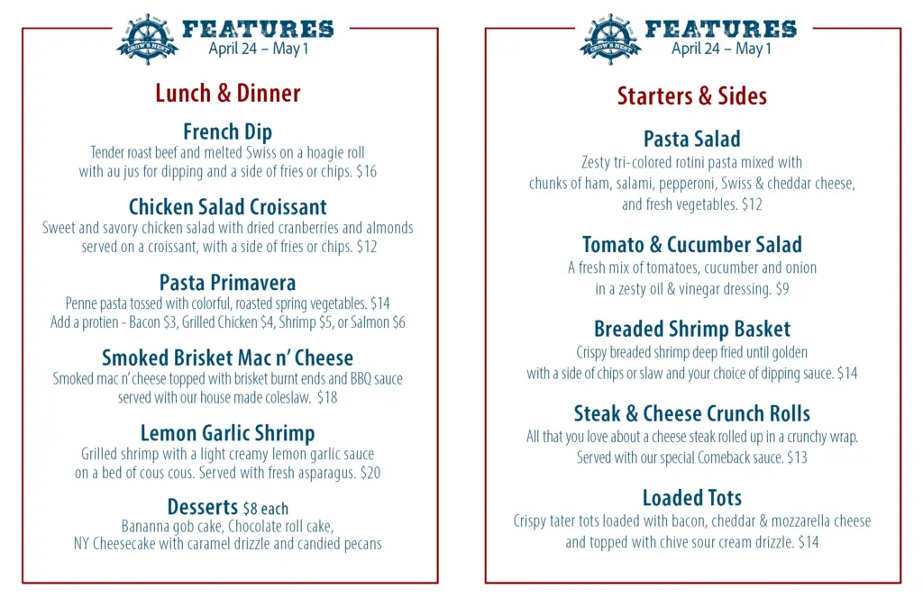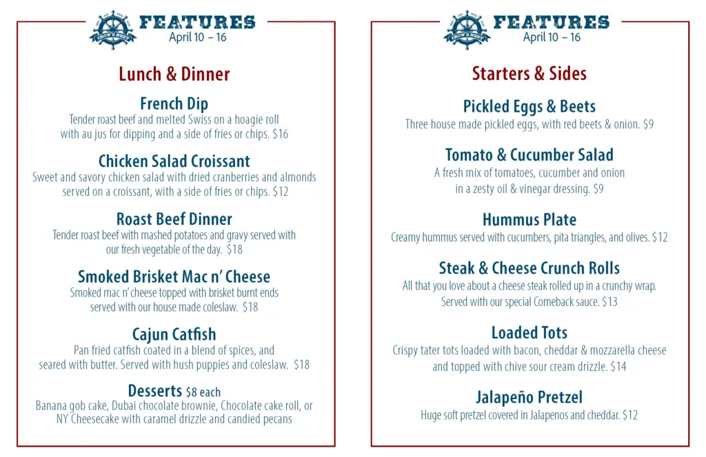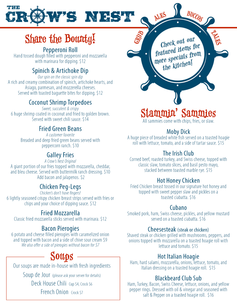 We are excited to offer you some new grub and some of the long time favorites. Our menu items and features will continue to adapt as we find new favorites! Stop by for a great time and delicious food! Weekly Specials